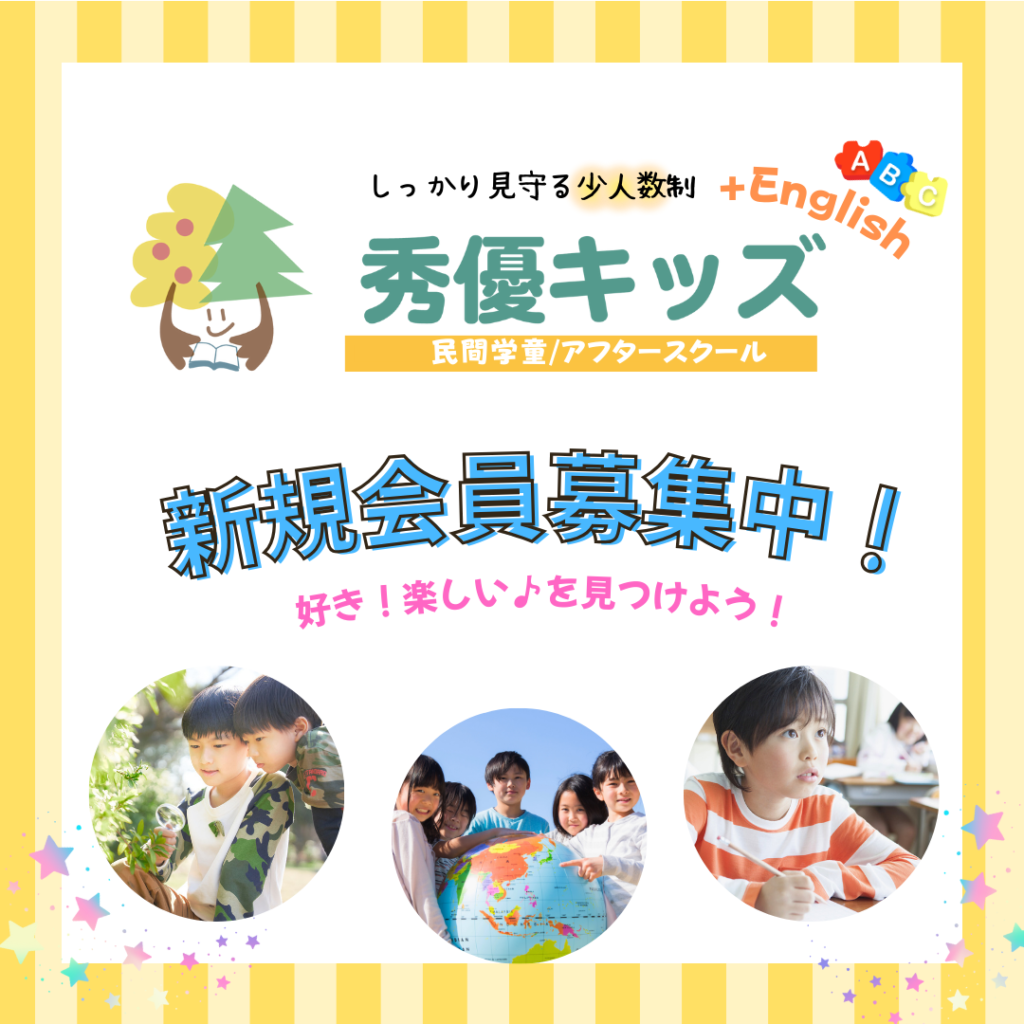 秀優キッズでは2026年度新規会員を募集中です。見学、体験は随時行っております。お気軽にお問い合わせください。 NEWS お知らせ よかったらシェアしてね! URLをコピーしました! URLをコピーしました! 早期入会予約割引実施中! 関連記事 早期入会予約割引実施中! 2025年10月10日 2025年 夏休み報告 2025年09月05日 満員御礼! 2025年06月12日 ありがとうございます! 2025年06月10日 夏のお知らせ 2025年06月09日 春のおためしパック 2025年02月18日 料金改定のお知らせ 2025年02月12日 秀優キッズ【冬のお知らせ】 2024年12月04日